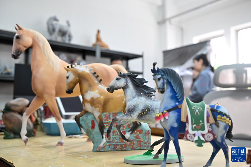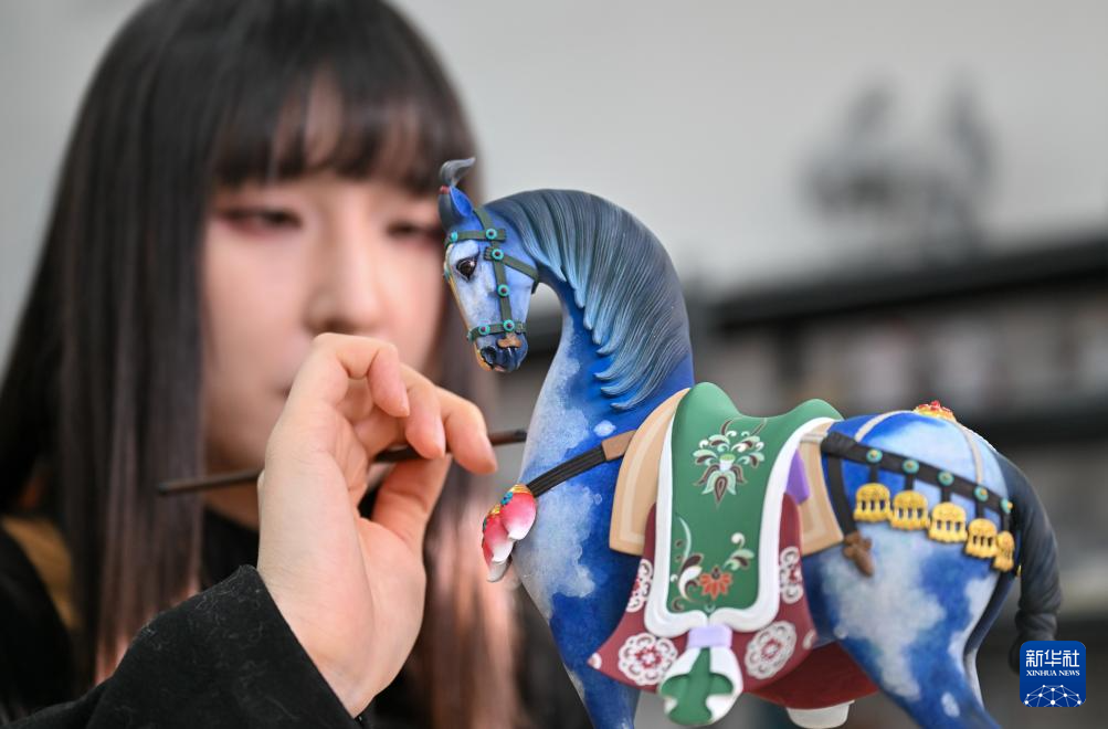 2月5日,在天津泥人张彩塑工作室,工艺美术师史庭瑄对作品《绀宝马》进行彩绘。