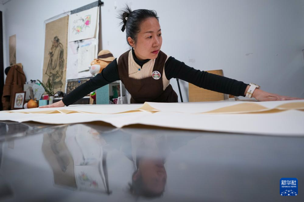 乔兰蓉在工作室里制作马年生肖年画《一马当先》(2月5日摄)。