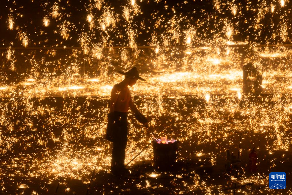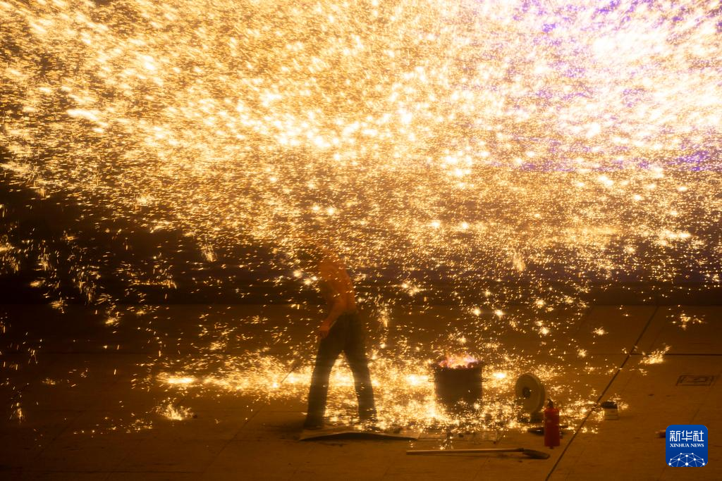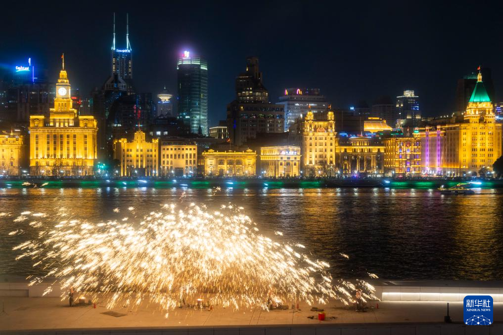 近日,首届“浦东中国年味节”在上海市浦东新区黄浦江畔举行,非遗“打铁花”成为夜色中一道亮丽的风景线。